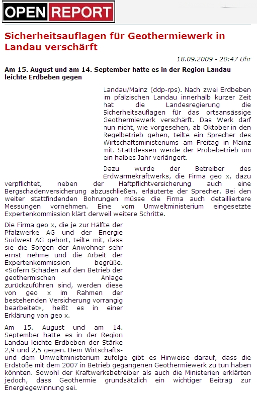 Nach einer in www.open-report.de veröffentlichten Meldung von ddp hat die Landesregierung die Sicherheitsauflagen für das Geothermiekraftwerk in Landau verschärft: Das Werk darf nun nicht, wie vorgesehen, ab Oktober in den Regelbetrieb gehen, teilte ein Sprecher des Wirtschaftsministeriums am Freitag in Mainz mit. Stattdessen werde der Probebetrieb um ein halbes Jahr verlängert. Dazu wurde der Betreiber des Erdwärmekraftwerks, die Firma geo-x, dazu verpflichtet, neben der Haftpflichtversicherung auch eine Bergschadenversicherung abzuschließen, erläuterte der Sprecher. Bei den weiter stattfindenden Bohrungen müsse die Firma auch detailliertere Messungen vornehmen. Eine vom Umweltministerium eingesetzte Expertenkommission klärt derweil weitere Schritte. Die Firma geo-x, die je zur Hälfte der Pfalzwerke AG und der Energie Südwest AG gehört, teilte mit, dass sie die Sorgen der Anwohner sehr ernst nehme und die Arbeit der Expertenkommission begrüße. «Sofern Schäden auf den Betrieb der geothermischen Anlage zurückzuführen sind, werden diese von geo-x im Rahmen der bestehenden Versicherung vorrangig bearbeitet», heißt es in einer Erklärung von geo-x. Am 15. August und am 14. September hatte es in der Region Landau leichte Erdbeben der Stärke 2,9 und 2,5 gegen. Dem Wirtschafts- und dem Umweltministerium zufolge gibt es Hinweise darauf, dass die Erdstöße mit dem 2007 in Betrieb gegangenen Geothermiewerk zu tun haben könnten. Sowohl der Kraftwerksbetreiber als auch die Ministerien erklärten jedoch, dass Geothermie grundsätzlich ein wichtiger Beitrag zur Energiegewinnung sei