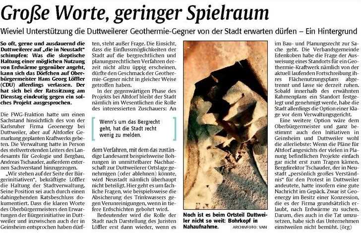 FWG-Stadtratsmitglied Gerhard Syring-Lingenfelder hat Oberbürgermeister Hans Georg Löffler gebeten, sowohl von der Landesregierung als auch von der Bürgerinitiative Duttweiler einen aktuellen Sachstand zum Geothermieprojekt Altdorf abzufordern. Bevor aber Andreas Tschauder vom Bergamt und Walter Scharfenberger von der Bürgerinitiative zu Wort kamen, hat der OB noch einmal bekräftigt, dass es einen Stadtratsbeschluss gebe, der nach wie vor gültig ist und an den er sich halten werde ("Stadtrat beschließt FWG-Antrag", siehe oben). Löffler betonte, dass er auf der Seite der Bürger stehe. Das veranlasste die Rheinpfalz wieder, einen Giftpfeil in Richtung Duttweiler abzuschießen: "So oft, gerne und ausdauernd die Duttweilerer auf „die in Neustadt" schimpfen: Was die skeptische Haltung einer möglichen Nutzung von Erdwärme gegenüber angeht, kann sich das Dörfchen auf Oberbürgermeister Hans Georg Löffler (CDU) allerdings verlassen." Weiter schreibt die Rheinpfalz: "Dass die klaren Worte des Oberbürgermeisters den Erwartungen der Bürgerinitiative in Duttweiler und inzwischen auch der in Geinsheim entsprochen haben dürften, steht außer Frage. Die Einsicht, dass die Einflussmöglichkeiten der Stadt auf die bergrechtlichen und planungsrechtlichen Verfahren derzeit nicht allzu üppig erscheinen, dürfte den Geschmack der Geothermie-Gegner nicht in gleicher Weise getroffen haben." Die wissen allerdings sehr wohl, dass die Stadt erst im Rahmen des Bebauungsplanverfahrens entsprechende Einwände vorbringen kann. Abschließend schreibt die Rheinpfalz: "Eine weitere Option wäre dem Oberbürgermeister und ganz bestimmt auch den Initiativen in Geinsheim und Duttweiler wohl die allerliebste: Wenn die Pläne für Altdorf angesichts der vielen in Planung befindlichen Projekte einfach gar nicht erst zum Tragen kämen. Bergdirektor Tschauder, der in Neustadt „persönlich großes Verständnis" für den Protest in Duttweiler andeutete, hatte insofern eine gute Nachricht im Gepäck. Zwar ist Geoenergy im Besitz einer Konzession, die es der Firma grundsätzlich erlaubt, nach Erdwärme zu suchen. Darum, dies auch in die Tat umzusetzen, habe sich das Unternehmen einstweilen nicht bemüht.